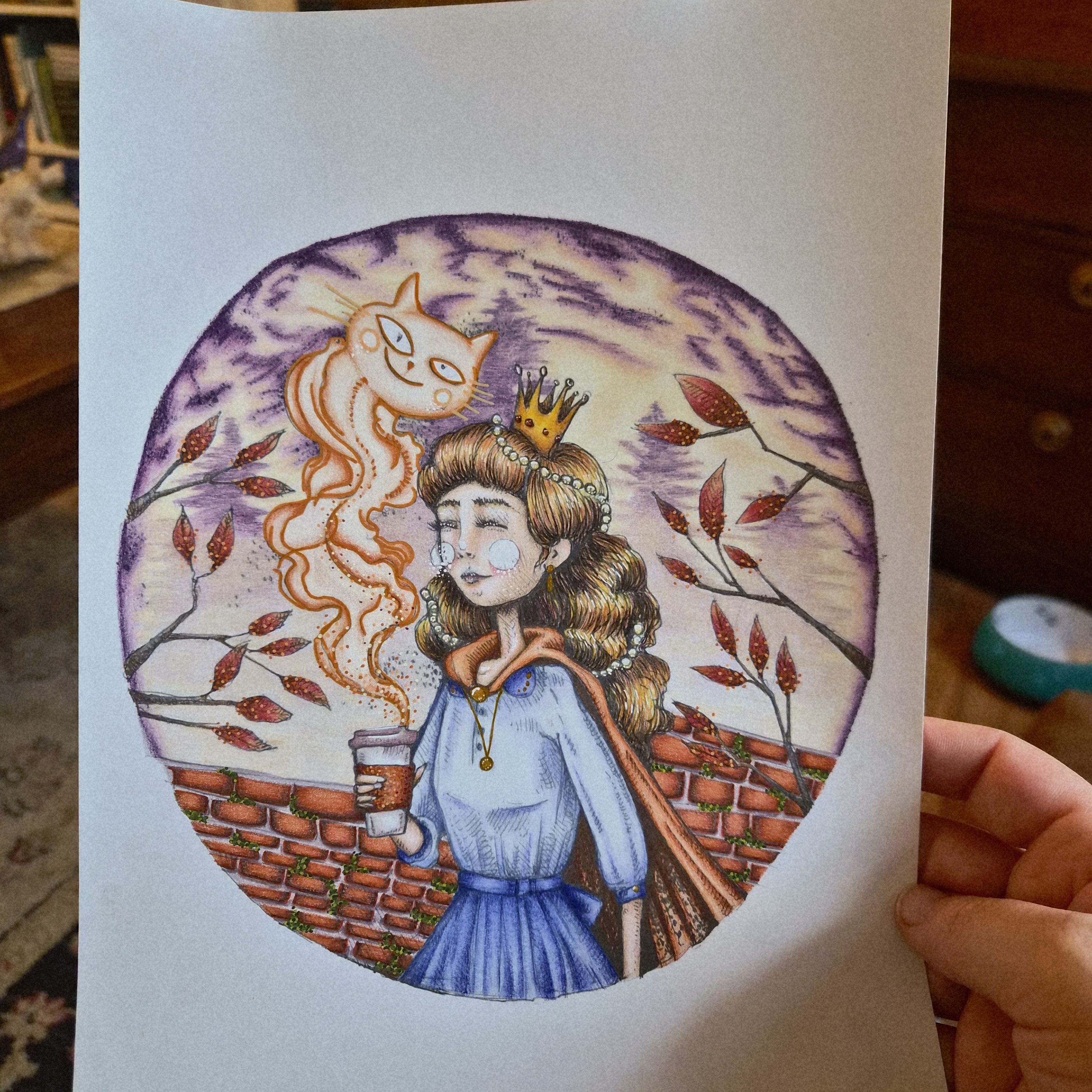 When I was flipping through Imaginary Friends by Karolina Kubikowska, my eye kept being drawn to this adorable scene, even though I’m positively TERRIFIED of coloring people- I’ve never successfully colored hair or skin before. But as it kept calling to me, I impulsively decided to bite the bullet and tear this page out so I could color it!