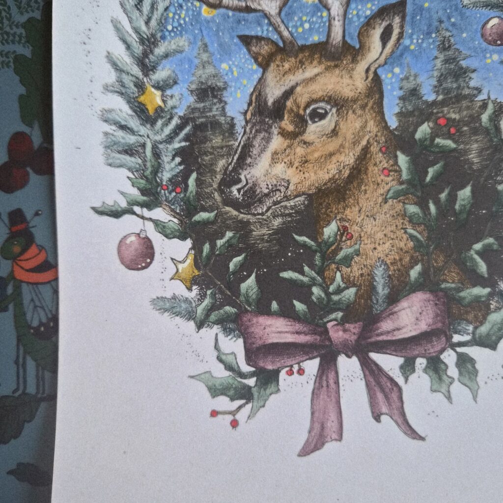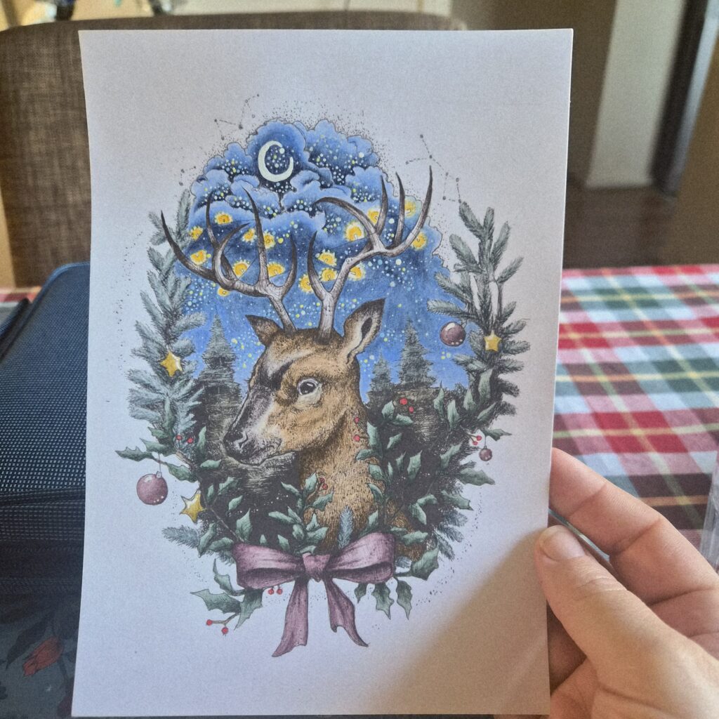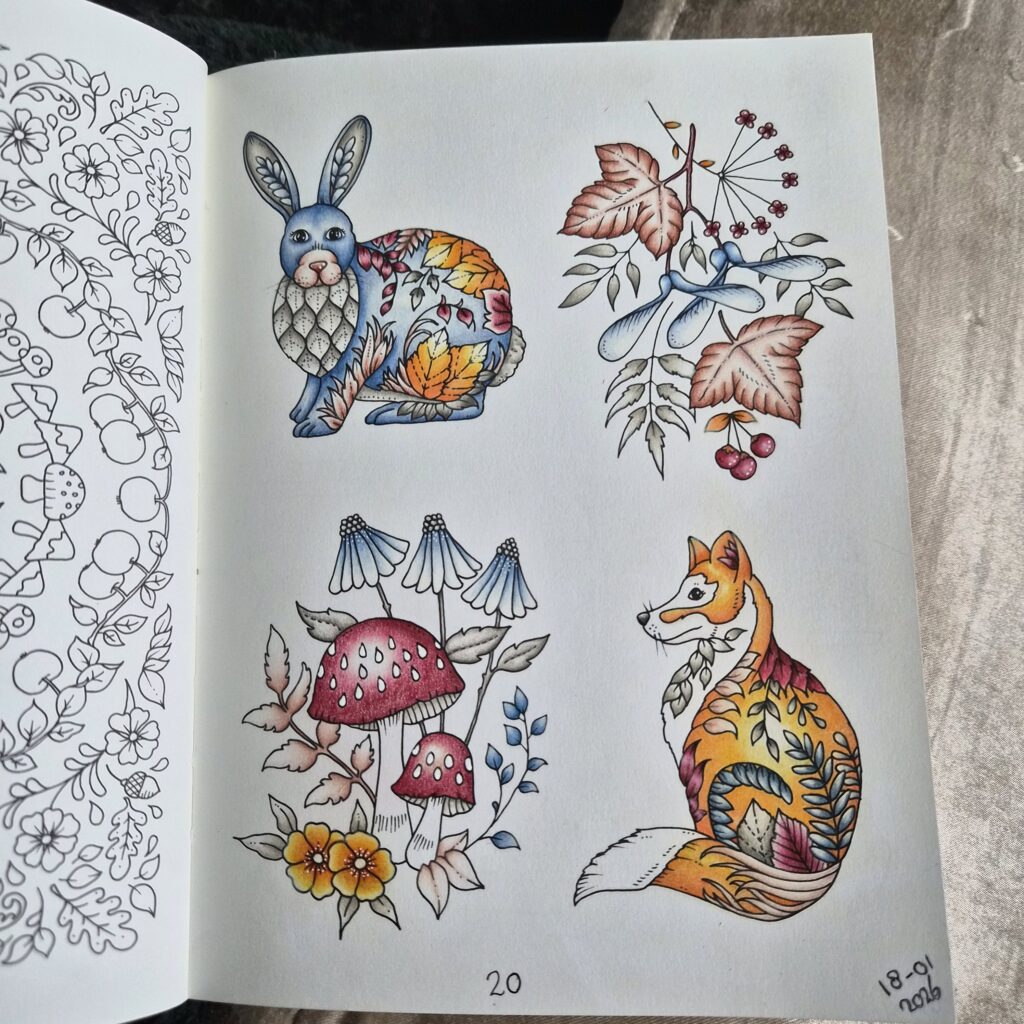 So three I realized it’s almost Christmas and therefore high time to do some holiday coloring! I picked a couple of pages from Karolina Kubikowska’s compilation coloring cards book, Memories and then promptly forgot all about them until approximately a week ago.