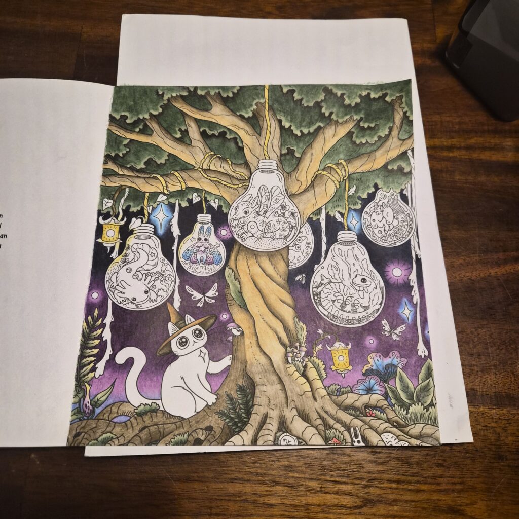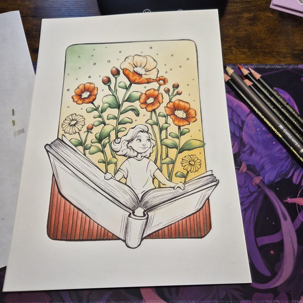 I’m currently working on a commissioned surprise project for my best friend Iris. It’s a gorgeous, dreamy scene by Reyhan Uydaci which I purchased on Etsy. I’ve finished the background and am currently working with my Chromaflow and CA Harmonious on the pencil areas.