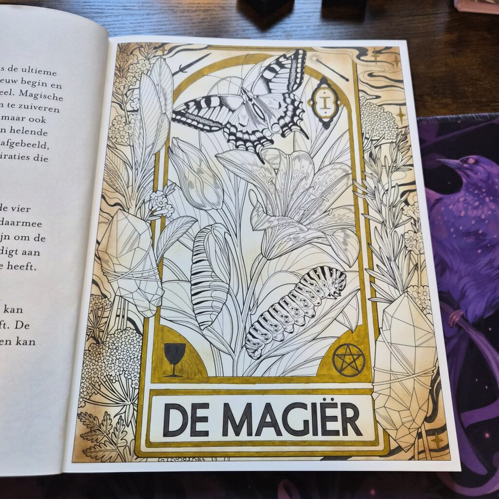 I’m insanely intimidated by my World of Tarot coloring book and subsequently it’s been sitting in my collection untouched since September last year. I figured it was high time to fix that and so I tackled the background with my Distress inks- aging the design significantly and then embellishing the lines of the card and background using my Kuretake Zig Wink of Stella brushpens in gold and gunmetal and so far I am LIVING!